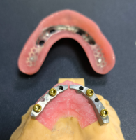 WM-hammaslaboratorion koko kaaren restaurointi CADCAM-titaaninen Ibar, joka on sijoitettu paikantimella ja irrotettava hammasproteesin päälle, jaettu tankoratkaisu epätavalliseen kiinnitysreittiin